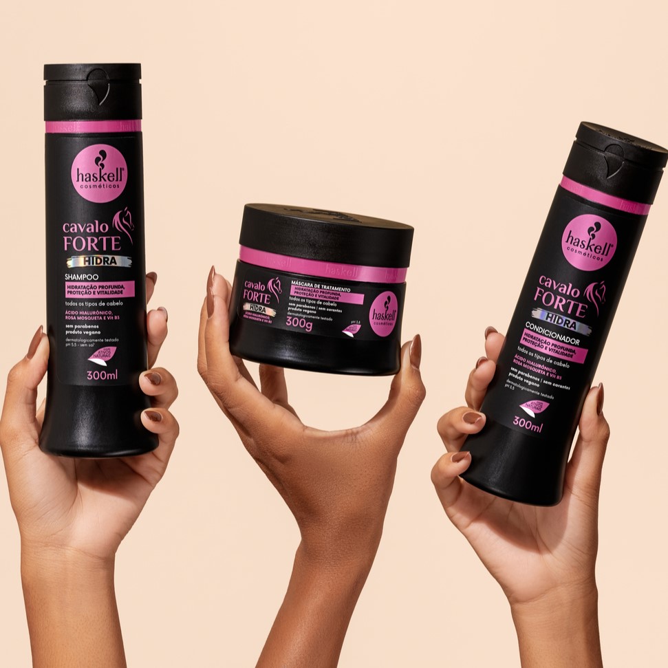 BENEFÍCIOS HIDRATAÇÃO PROFUNDA, PROTEÇÃO E VITALIDADE Indicação: para todos os tipos de cabelo O melhor do Cavalo Forte aliado ao poder da hidratação! A linha promove hidratação intensa e age na camada mais profunda da fibra capilar, evitando o ressecamento e proporcionando vitalidade, proteção e brilho extra aos cabelos.